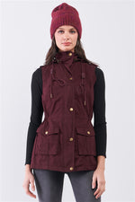 Burgundy Sleeveless Foldable Detachable Hood Detail Parka Utility Vest
