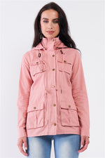 Washed Blush Pink Cotton Front Zip-Up & Button Down Detachable Hood Detail Utility Jacket
