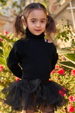Girls Black Ribbed Knit Cut-Out Shoulder Detail Long Balloon-Y Sleeve Turtleneck Sweater