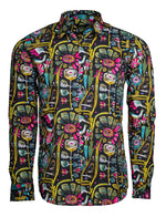 Men’s Casual Shirt 100% Cotton – Long Sleeve Black Shirt with Multi Color Flower Style Pattern – Slim Fit - Made in Turkey