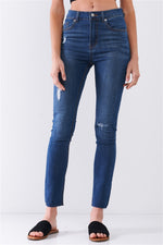 Medium Blue Denim Mid-Rise Ripped Detail Skinny Jean Pants